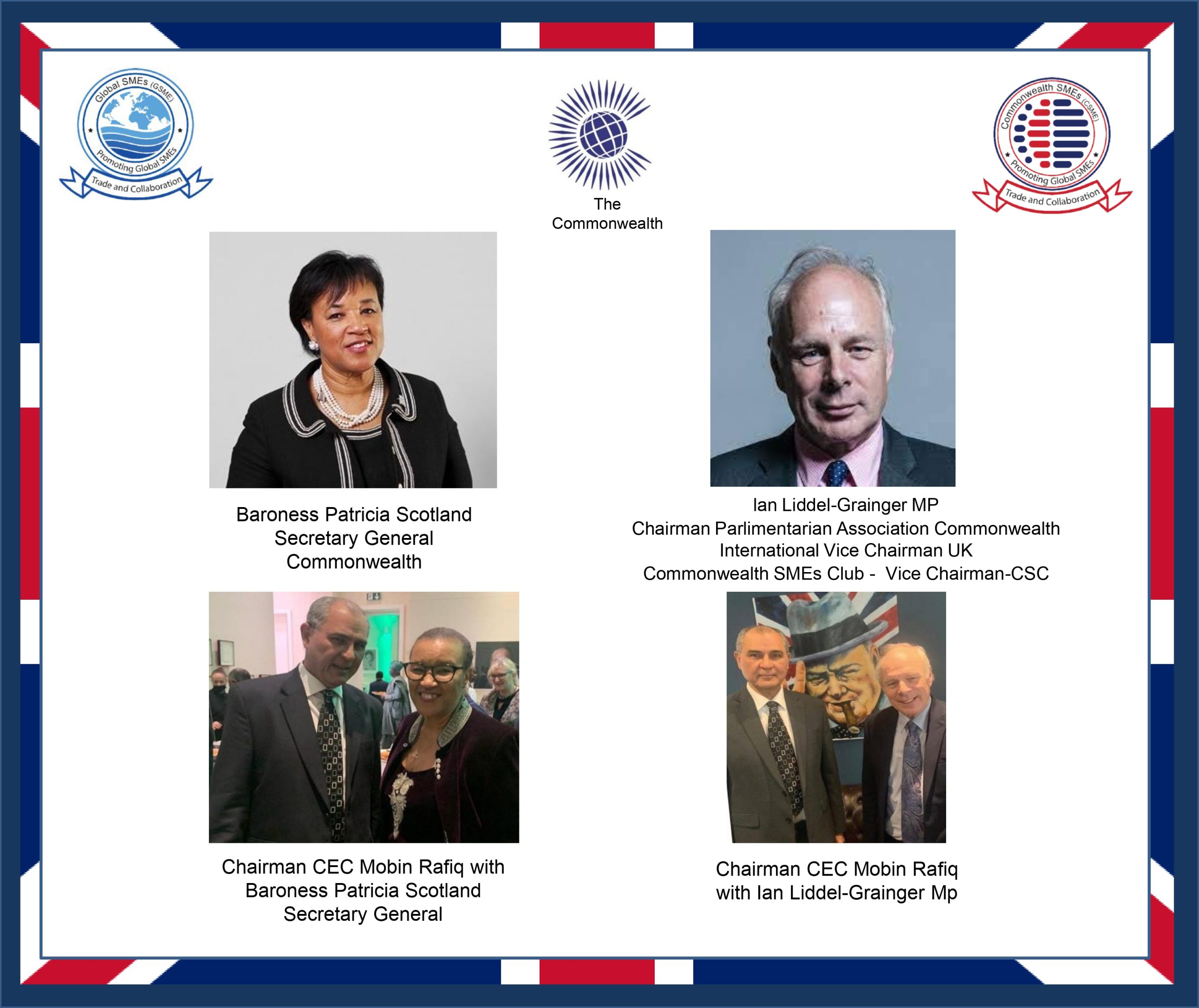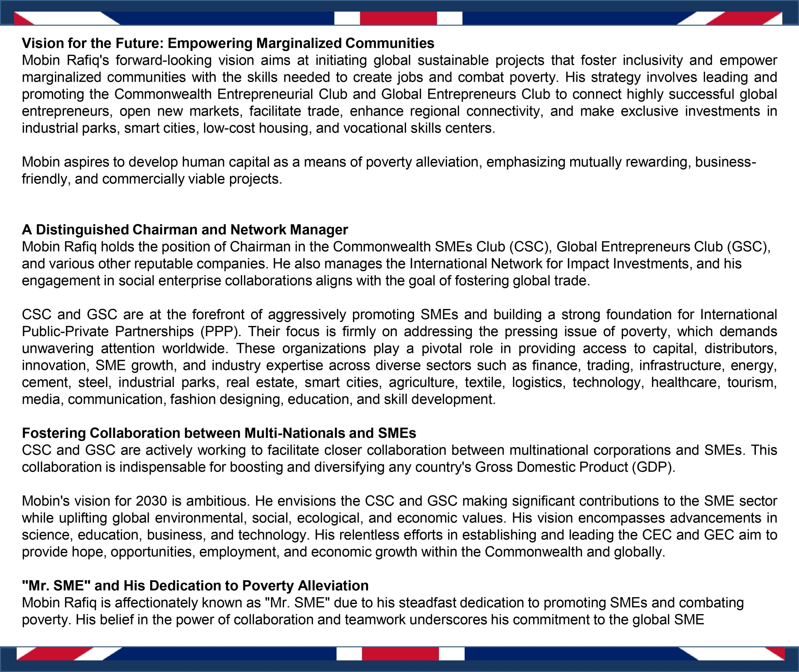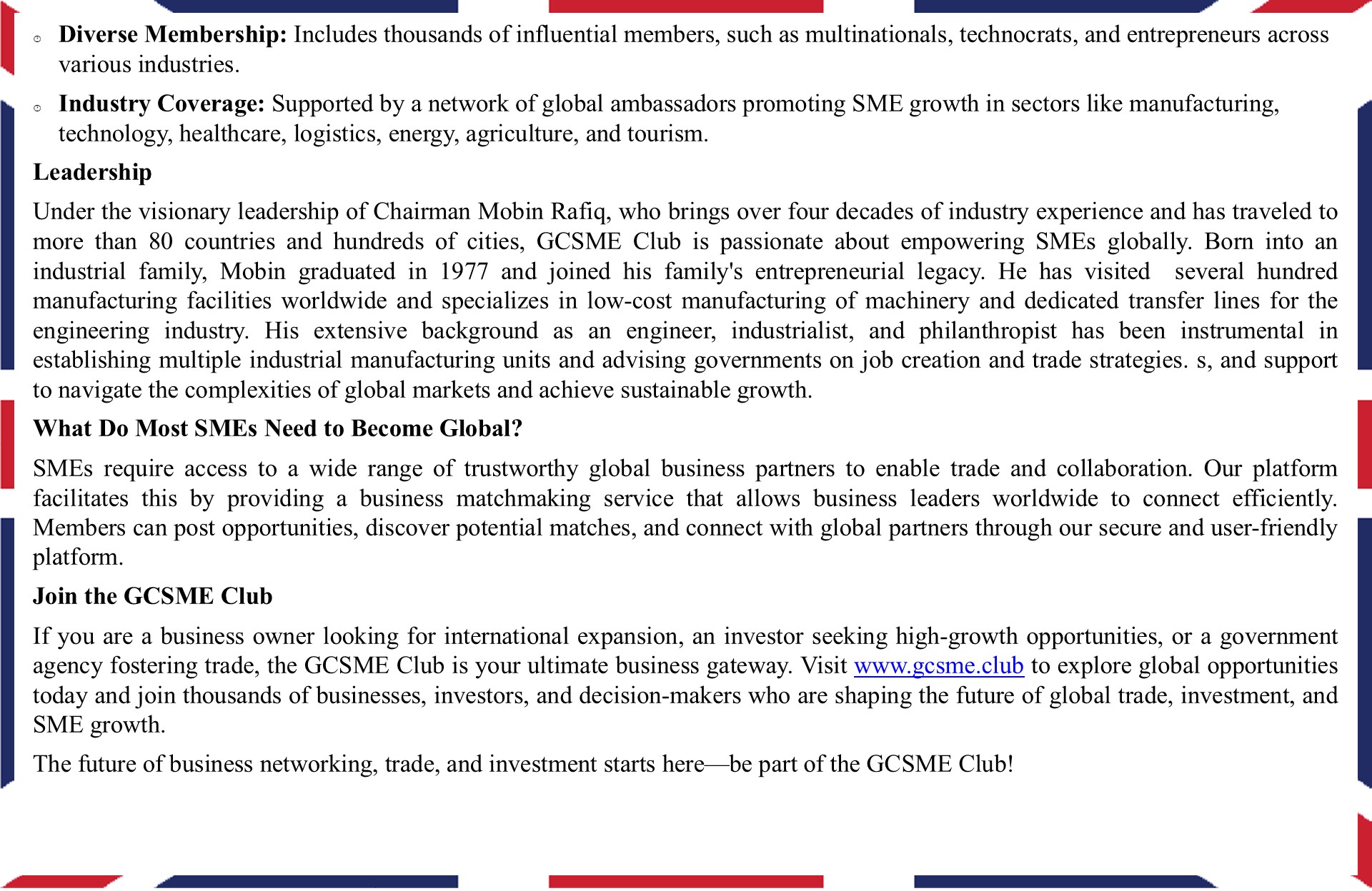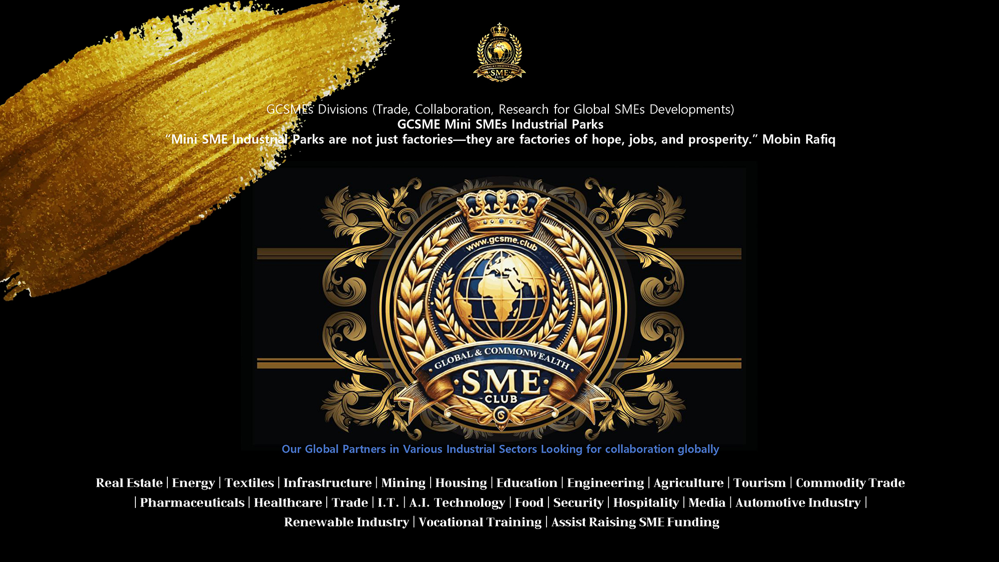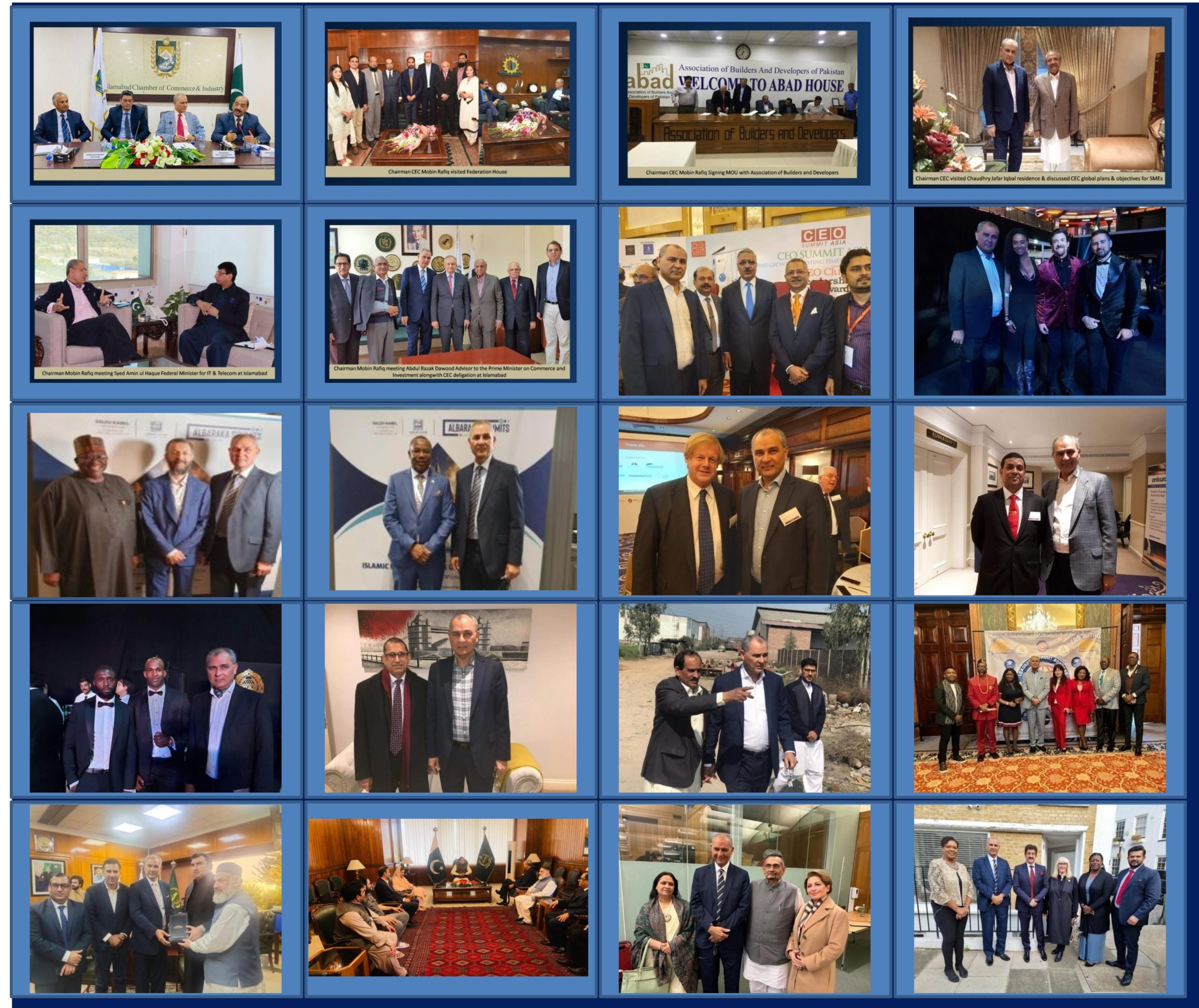 Empowering SMEs for Global Trade and Growth Connecting SMEs worldwide to unlock opportunities, foster collaboration, and drive sustainable business growth. Learn More Key Collaborations Spotlight on Chairman & VIP Events Discover key moments from our global engagements. Chairman Mobin Rafiq and international VIPs have fostered collaborations that drive the growth and success of SMEs worldwide.